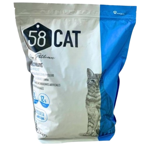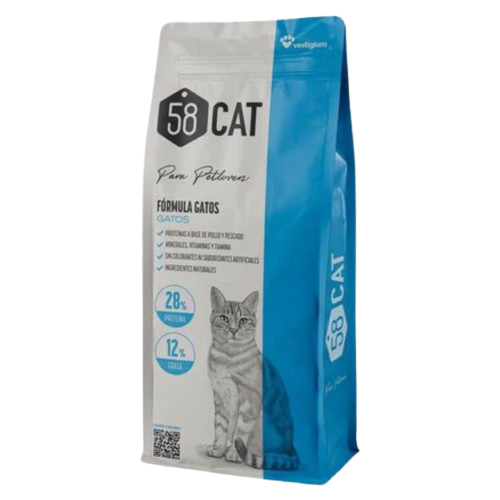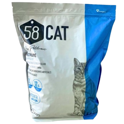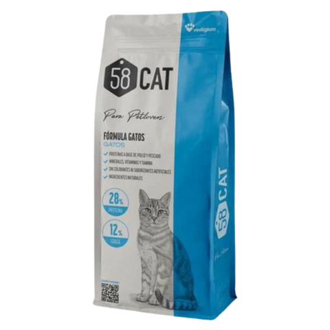 Fabricado en Israel, exclusivamente para Venezuela. Aprobado y recomendado por el Colegio Veterinario del Estado Miranda. 58 Cat, formulado con proteínas (pollo y pescado) de alta calidad, grasas y carbohidratos, proporciona una nutrición completa y equilibrada. Enriquecido con vitaminas y minerales que fortalecen la visión y el sistema inmune, así como diversos antioxidantes. Con un excelente sabor gracias a su combinación de pollo y pescado.