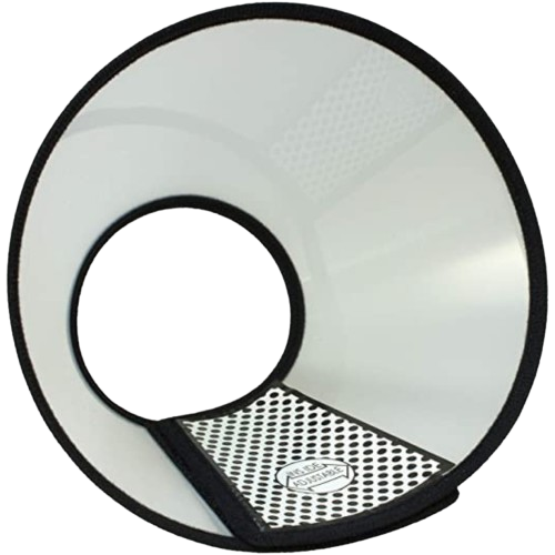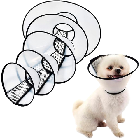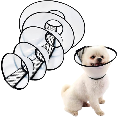 - Collar isabelino, brinda una protección de forma troncocónica, material de plástico traslucido, que se ajusta en el cuello de la mascota.
