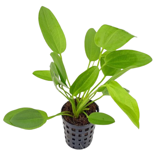 Es una planta de acuario fácil que no supera los 25 cm de altura. Las hojas sumergidas son alargadas en forma de huevo a levemente en forma de corazón y de un color verde claro a medio. Las hojas sumergidas son más redondeadas con un tallo más largo. Una característica típica de esta planta espada son a menudo raíces retorcidas en espiral. Con buena iluminación y suministro de nutrientes, forma rosetas de hojas densas y relativamente bajas. Se adapta bien al medio o como grupo pequeño en el primer plano de tanques más grandes.