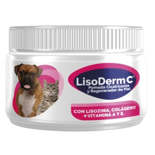 LISODERM C® es una pomada regeneradora de la piel formulada con lisozima, colágeno, vitamina A y E. Es ideal para hidratar, suavizar y dar elasticidad a la piel de tu mascota, hidrata la piel evitando la resequedad, irritación y enrojecimiento, promueve la regeneración de la piel y favorece el crecimiento del pelaje manteniendo el equilibrio microbiano natural. LISODERM C® se aplica directamente sobre la piel afectada. Es una solución segura y eficaz para mantener la piel de tu mascota sana y protegida.