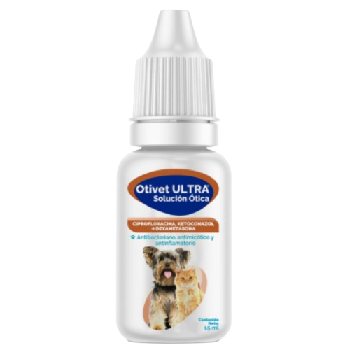 OTIVET ULTRA® es una solución ótica para el tratamiento de la otitis externa aguda en perros y gatos. Está formulado con ciprofloxacina, fosfato de dexametasona y ketoconazol, que ofrecen una acción: Bactericida inmediata, antiinflamatoria y antimicótica.