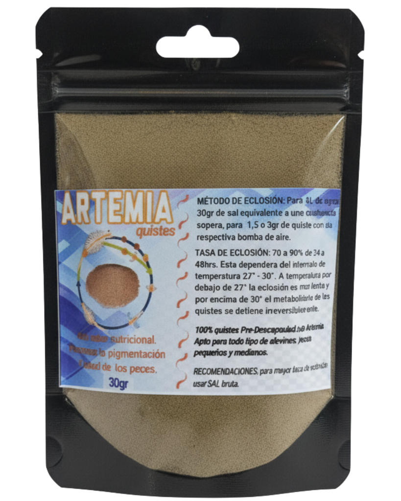Método de eclosión: Para 1 lt de agua 14gr de sal equivalente a una cucharada sopera, para 1,5 o 3 gr de quiste con su respectiva bomba de aire.