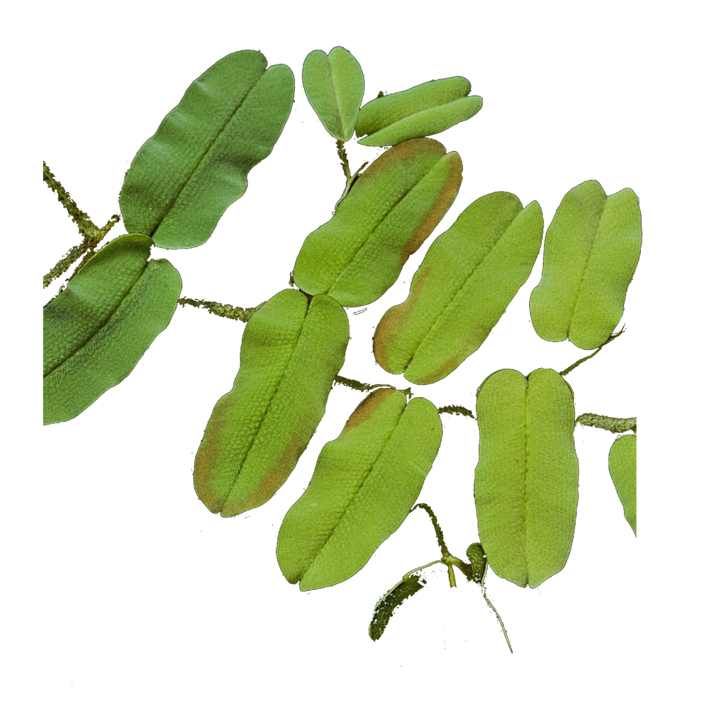 Las hojas son pequeñas, de color verde oscuro, bilobadas, ovaladas y unidas entre sí.