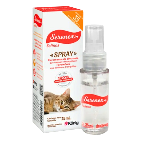 Rociar el sitio que habitualmente frecuenta el animal (almohadón, dormidero, etc.) o sobre algún elemento que con el que esté en contacto (collar, peluche, etc.). SERENEX® Spray Felinos debe ser colocado por lo menos 15 minutos antes de exponer al gato al sitio rociado. Se deben realizar entre 6 y 8 rociadas aproximadamente a 10 cm del objeto para un (1) tratamiento. El efecto de SERENEX® Spray Felinos tiene una duración aproximada de 4 a 5 horas. En caso de volver a aplicar, recuerde tratar el objeto lejos del animal y esperar al menos 15 minutos antes de exponerlo nuevamente. Puede usarse durante todo el tiempo que desee, sin restricciones.