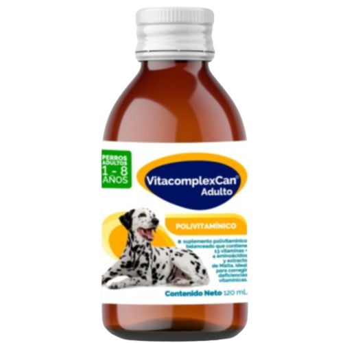 Vitacomplex Can Adulto complejo multivitamínico con aminoácidos, extracto de malta y taurina, ideal para perros adultos de todas las razas. fortalece el sistema inmunológico, mejora la salud de la piel y el pelaje, Aporta energía y vitalidad, favorece la absorción de calcio y fósforo para mantener huesos fuertes, estimula el sistema nervioso, previene la anemia, ayuda a combatir la inapetencia, corrige deficiencias vitamínicas y de aminoácidos.